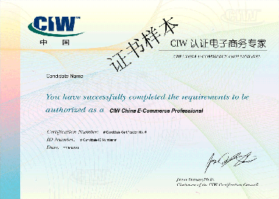 注:以上每門課程通過后可獲得美國 VCampus 公司頒發的電子商務類分證書一張, 通過全部三門后可獲得 CIW 電子商務專家總證書。
