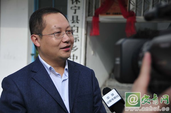 在白際小學的捐贈儀式現場,安徽新華電腦專修學院何貴金院長接受安徽電視臺的采訪