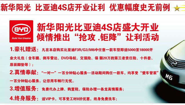 1. 豪禮贈送:凡在本店購買比亞迪F3R/G3/M6中任意一款車型即送5000至18000開業大禮包(含車膜、倒車雷達、DVD導航、交強險、保 額20萬的第三者責任險、十件套、原裝腳墊等);