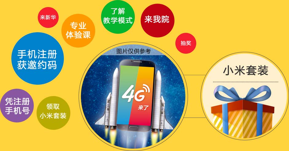 通過學院官網手機注冊獲取邀約碼,來學員均可領取數碼產品一份。還可申請專業體驗課,更深層了解新華教學模式。成功報名的同學,還可以領取品牌4G手機一部和小米套裝。