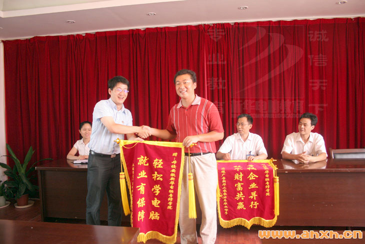 贈旗儀式在西區第一會議室隆重舉行,上海得搜廣告公司經理韓璐、安徽新華電腦專修學院副院長束開俊、院就業辦主任鄭成鯤、院西區主任張榮福以及老師代表和部分在校學子參加了儀式。