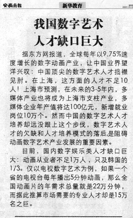 4月6日,《安徽商報》報道:“我國數字藝術人才缺口巨大”的新聞,敬請關注!