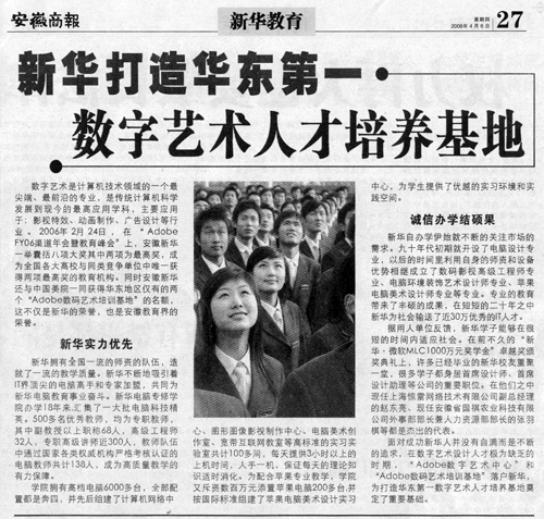 數(shù)字藝術(shù)是計(jì)算機(jī)技術(shù)領(lǐng)域的一個(gè)最尖端、最前沿的專業(yè),是傳統(tǒng)計(jì)算機(jī)科學(xué)發(fā)展到現(xiàn)今的最高應(yīng)用學(xué)科,主要應(yīng)用于:影視特效、動(dòng)畫(huà)制作、廣告設(shè)計(jì)等行業(yè)。2006年2月24日,在“Adobe FY06渠道年會(huì)暨教育峰會(huì)”上,安徽新華一舉囊括八項(xiàng)大獎(jiǎng)其中兩項(xiàng)為最高獎(jiǎng),成為全國(guó)各大高校與同類(lèi)競(jìng)爭(zhēng)單位中唯一獲得兩項(xiàng)最高獎(jiǎng)的教育機(jī)構(gòu)。同時(shí)安徽新華還與中國(guó)美院一同獲得華東地區(qū)僅有的兩個(gè)“Adobe數(shù)碼藝術(shù)培訓(xùn)基地”的名額。這不僅是新華的榮譽(yù),也是安徽教育界的榮譽(yù)。