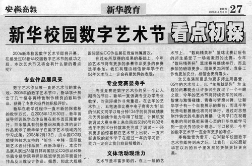 4月6日,《安徽商報》報道:“新華校園數字藝術節看點初探”的新聞,敬請關注!