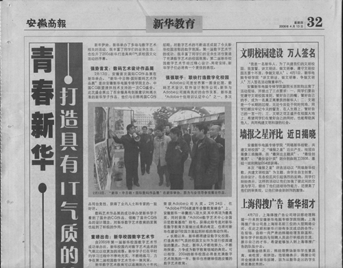 長期以來,新華都將建設(shè)數(shù)字化校園、打造具有IT氣質(zhì)的校園文化作為校園建設(shè)的重點。為此,新華人不斷地努力、不斷地探索,力爭成為數(shù)字教育領(lǐng)域的典范。可以相信,2006的新華校園必將是充滿數(shù)字藝術(shù)氛圍的一年,新華也將繼續(xù)領(lǐng)跑安徽數(shù)字藝術(shù)教育。