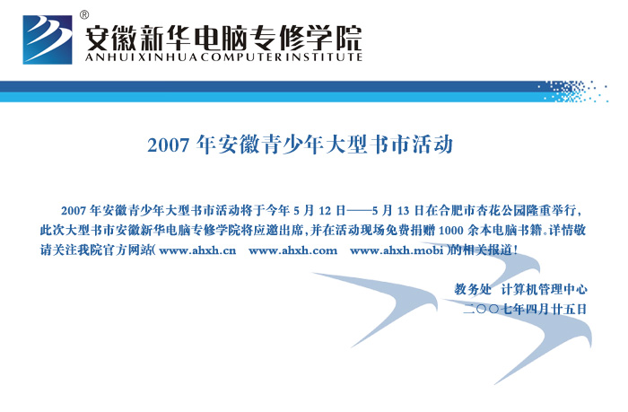 當(dāng)前位置:首頁 > 新聞中心 > 通知通告 > 2007年安徽青少年大型書市活動(dòng)