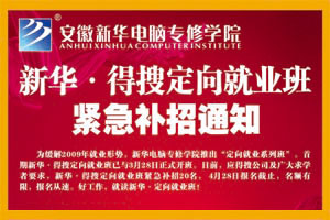 為緩解2009年就業(yè)形勢,新華電腦專修學(xué)院推出“定向就業(yè)系列班”。首期新華·得搜定向就業(yè)班已與3月28日正式開班。日前,應(yīng)得搜公司及廣大求學(xué)者要求,新華·得搜定向就業(yè)班緊急補招20名, 4月28日報名截止,名額有限,報名從速。