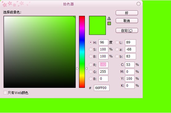 2)設(shè)置前景色RGB值為(102、225、0),按下Alt+Delete鍵填充前景色圖層。如圖所示: