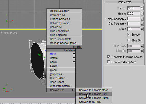 (1) 首先在Create(創建)面板Standard Primitives(標準幾何體)中選擇Cylinder(圓柱)物體,然后在Left(左)視圖建立出Cylinder(圓柱)物體,設置該圓柱體的具體數值是Radius(半徑)為30,Height(高)為20。接下來設置段數Height Segments(高度段數)為1,Cap Segments(端面段數)為1,Sides(邊緣段數)為10。建立完成以后回到Perspective(透視)圖中,在圓柱物體上單擊鼠標的右鍵,在彈出的快捷菜單中選擇Convert to(轉換為)>Convert to Editable Poly(轉換塌陷為可編輯多邊形)命令,將圓柱體轉化成Edit Poly編輯模式,如圖1-1。