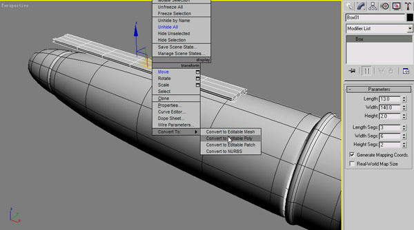 (5) 繼續(xù)在Create(創(chuàng)建)面板三維物體中選擇建立Box(長(zhǎng)方體)物體,Box(長(zhǎng)方體)物體的Length(長(zhǎng))為13,Width(寬)為140,Height(高)為2,內(nèi)部Length Segs(長(zhǎng)度段數(shù))為3,Width Segs(寬度段數(shù))為6,Height Segs(高度段數(shù))為2。接下來(lái)在Box(盒子)物體上單擊鼠標(biāo)的右鍵,在彈出的快捷菜單中選擇Convert to(轉(zhuǎn)換為)>Convert to Editable Poly(轉(zhuǎn)換為可編輯多邊形)命令,將Box(長(zhǎng)方體)物體轉(zhuǎn)化成Edit Poly的編輯模式,如圖2-5所示。