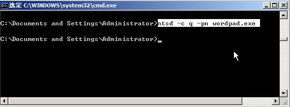 命令一:ntsd -c q -pn 進(jìn)程名,這里進(jìn)程名表示wordpad.exe。所以套用一下后,在命令提示符后輸入ntsd -c q -pn wordpad.exe即可關(guān)閉寫字板進(jìn)程,如圖1-3所示,大家在輸入命令時(shí)一定要注意空格的輸入。至于命令的具體含義請(qǐng)參考DOS中的命令提示,在此不再多說。