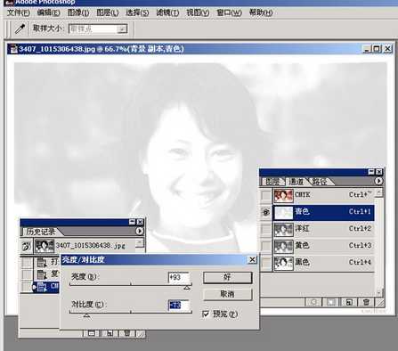 2、選青色通道,將對比度調小,亮度調大。人的皮膚色即可出來。不滿意的話又可采用其它手段再調調。