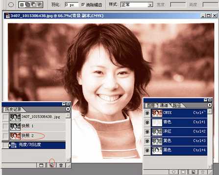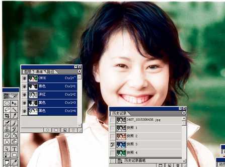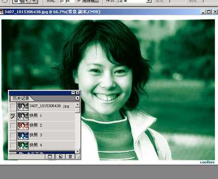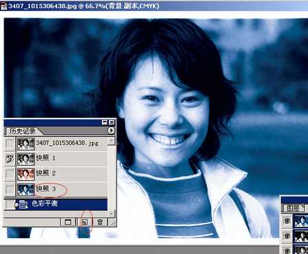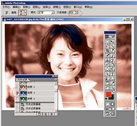6、點快照2 ,恢復到橘黃色畫面,現在利用歷史畫筆,畫頭發,點藍色快照最左邊空格,就可開始了。在大塊面歷史畫筆的筆頭選大點,不透明度也大點。在交接部位筆頭選小點,不透明度也小點。你馬上可以感受到快照和歷史畫筆的功效了。(在這里頭發是偏藍的,你可說成其它的)背景是利用綠色快照,原理和這一樣。