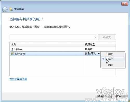 我們以將一臺電腦的E盤根目錄下的Share文件夾進行共享為例。首先鼠標右鍵單擊E盤根目錄下的Share文件夾,選擇“屬性→共享”。然后在打開的對話框中單擊“共享”,在彈出的對話框中選擇用戶名為Everyone,再單擊“添加”,讓它出現在下面的列表框中。接下來在“權限級別”下為其設置權限,比如:“讀/寫”或“讀取”(如圖1所示)。