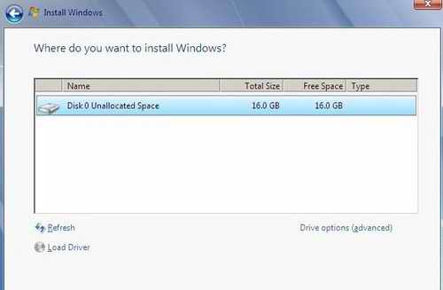 圖2 安裝程序只識別出一個(gè)硬盤分區(qū) 事實(shí)上,當(dāng)出現(xiàn)圖2所示的界面時(shí),并非是說Windows 7安裝程序有問題,也并不是就意味著硬盤本身有問題。點(diǎn)擊上圖中的“DriverOptions(advanced)”按鈕后,Windows 7安裝程序會(huì)讓用戶新建分區(qū)(如圖3,請注意對比圖2和圖3的不同)。